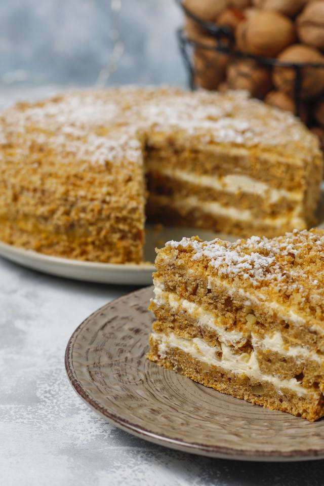 Wallpaper Honey cake on a table with nuts and a cup of coffee