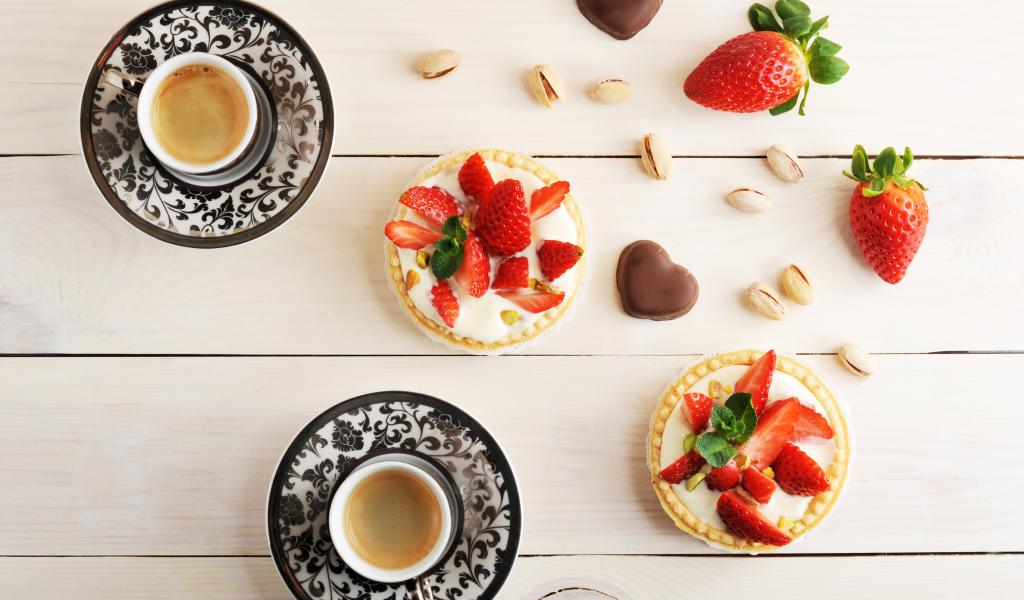 Wallpaper Cakes with strawberries on a table with coffee