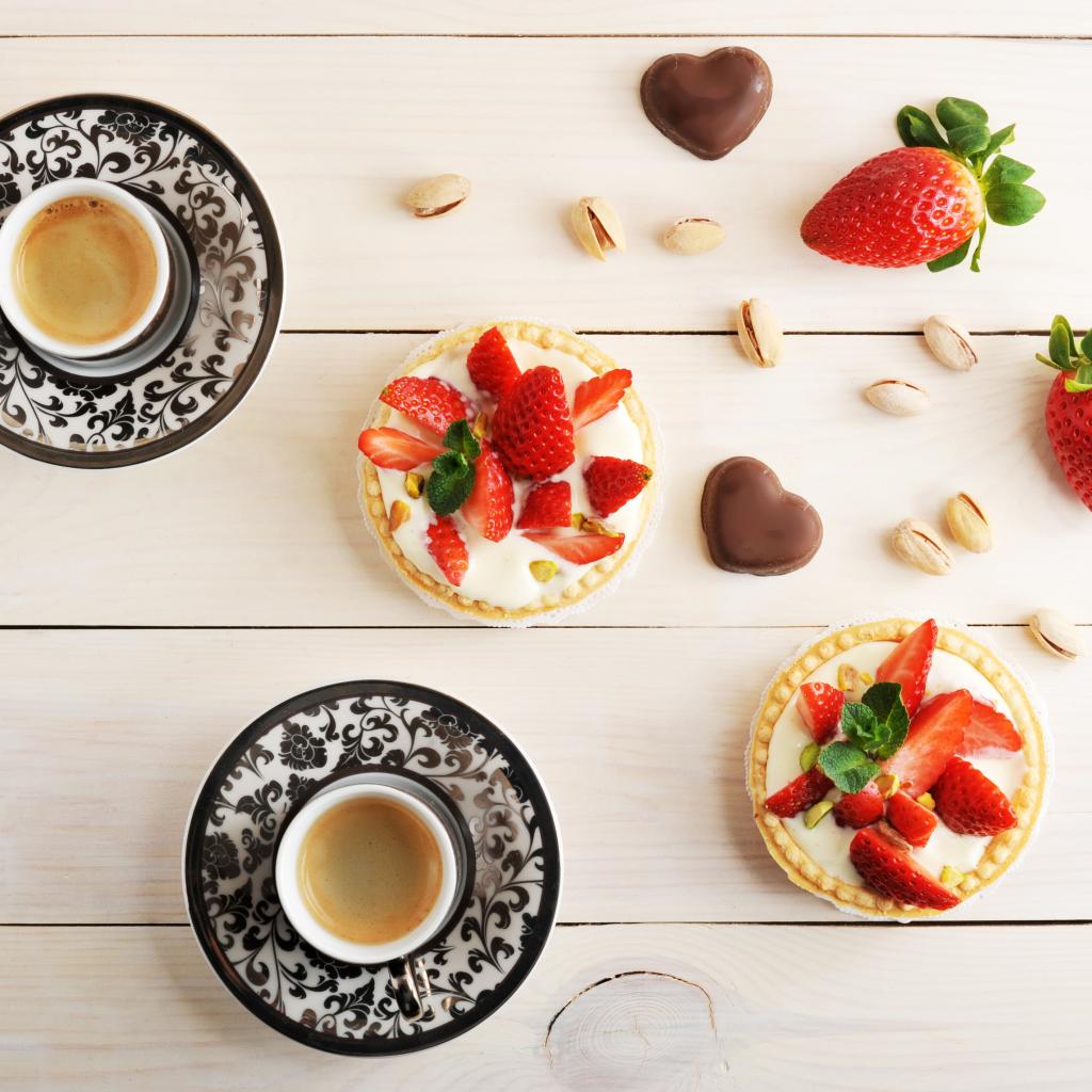 Wallpaper Cakes with strawberries on a table with coffee