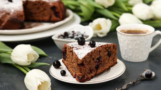 Wallpaper A piece of cake with currants on a table with tulips
