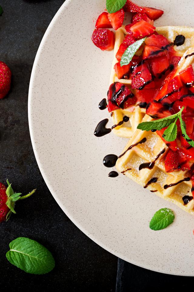 Wallpaper Sweet waffles on a plate with sliced strawberries