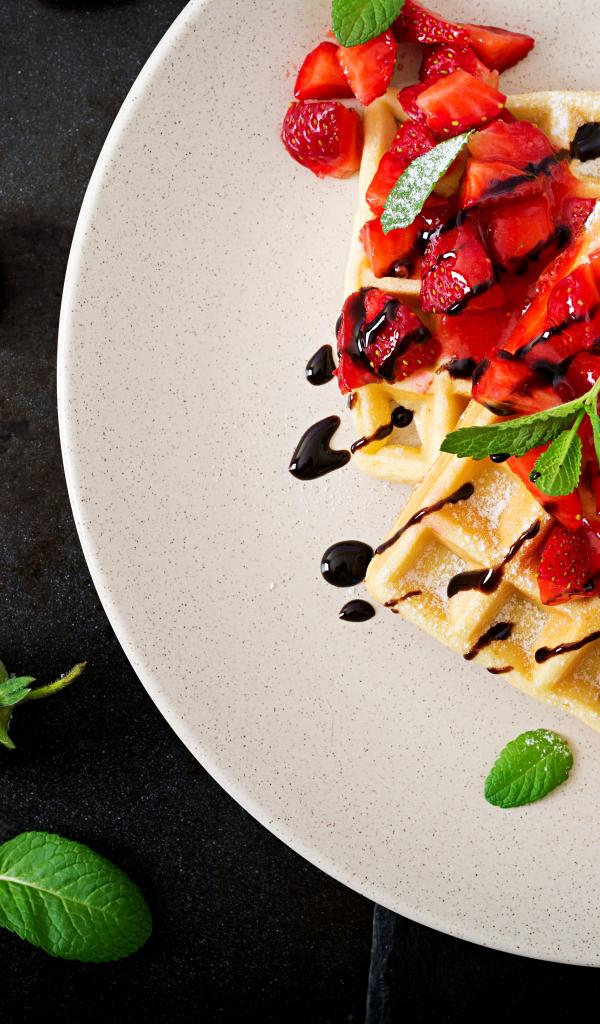 Wallpaper Sweet waffles on a plate with sliced strawberries