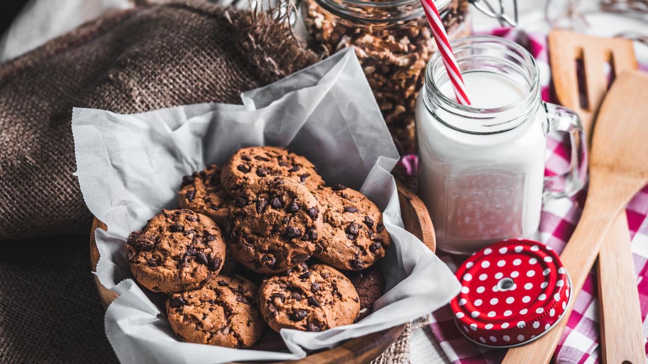 Wallpaper Tasty cookies with chocolate on a table with milk