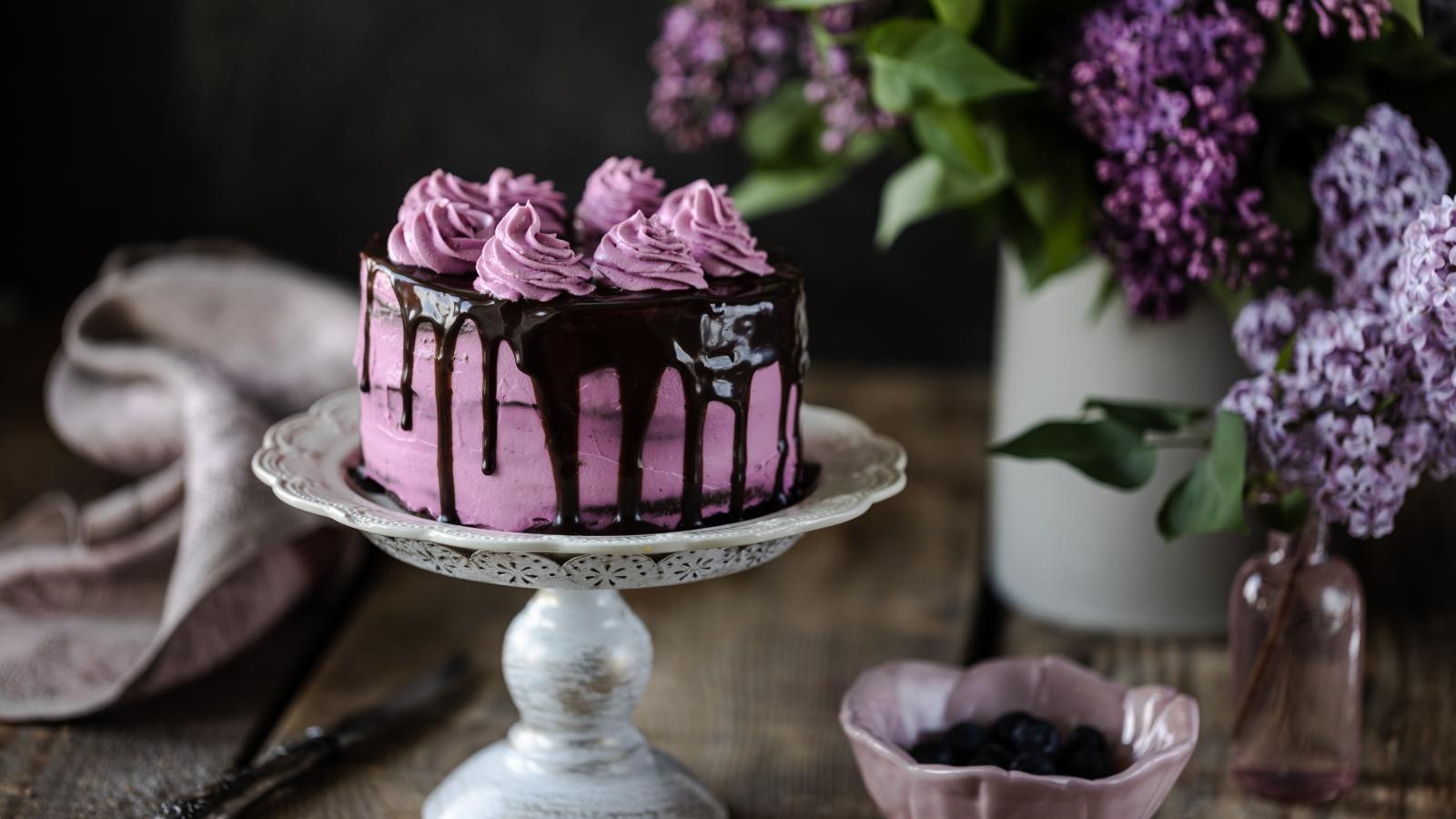 Wallpaper Berry cake with chocolate on a table with lilacs