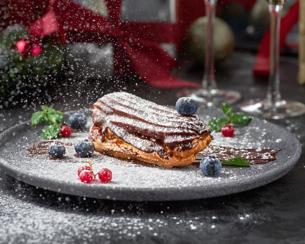 Wallpaper Tasty cake on a plate with icing sugar and berries