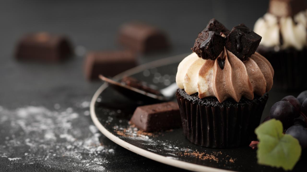 Wallpaper Chocolate cream with cream on a plate with grapes
