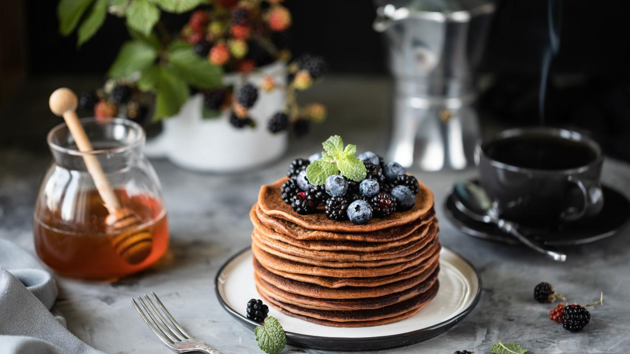 Wallpaper Buckwheat pancakes with berries on a table with honey