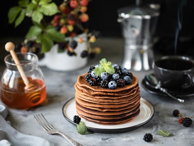 Wallpaper Buckwheat pancakes with berries on a table with honey