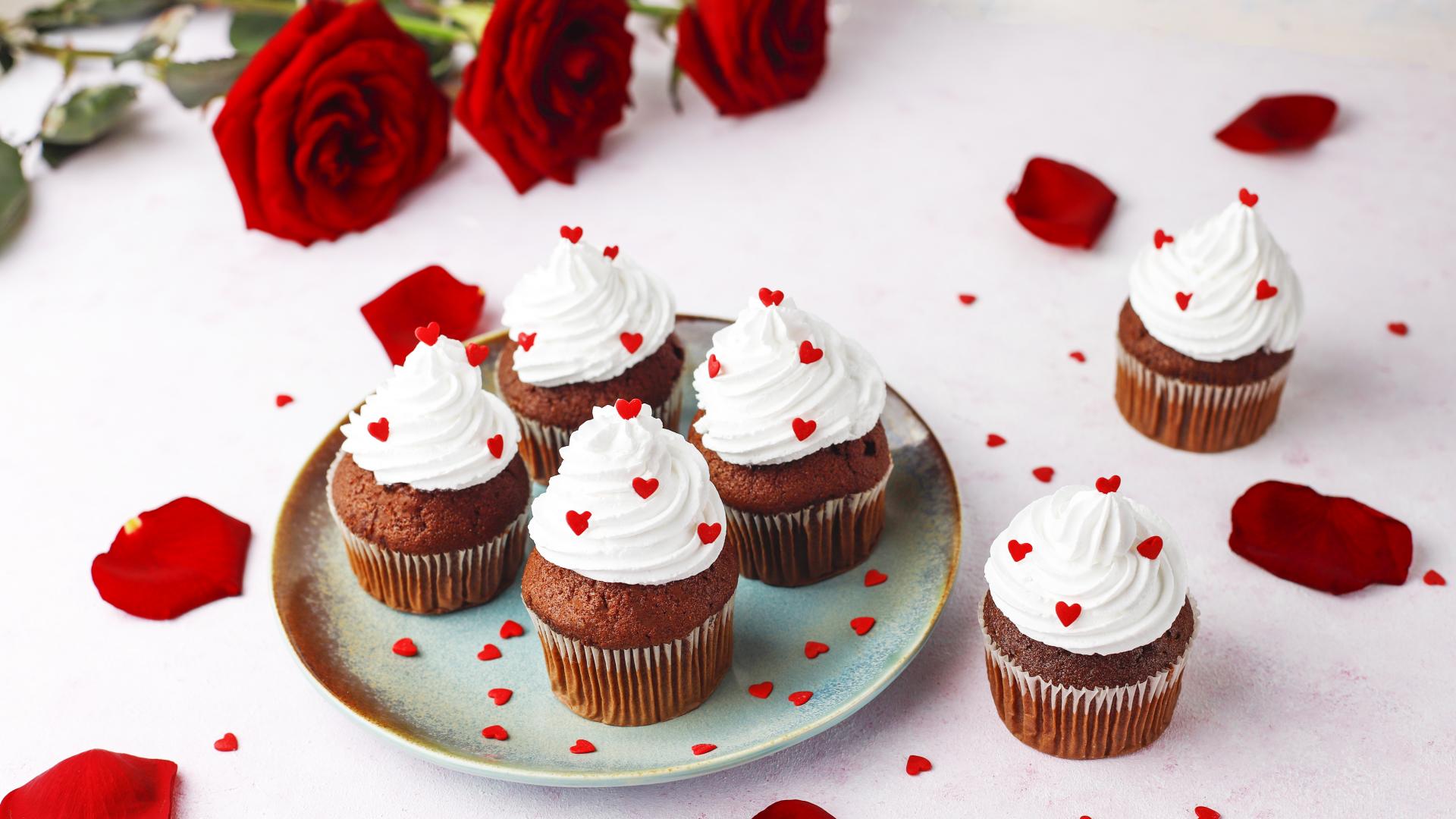 Wallpaper Cupcakes with cream on a table with a bouquet of roses