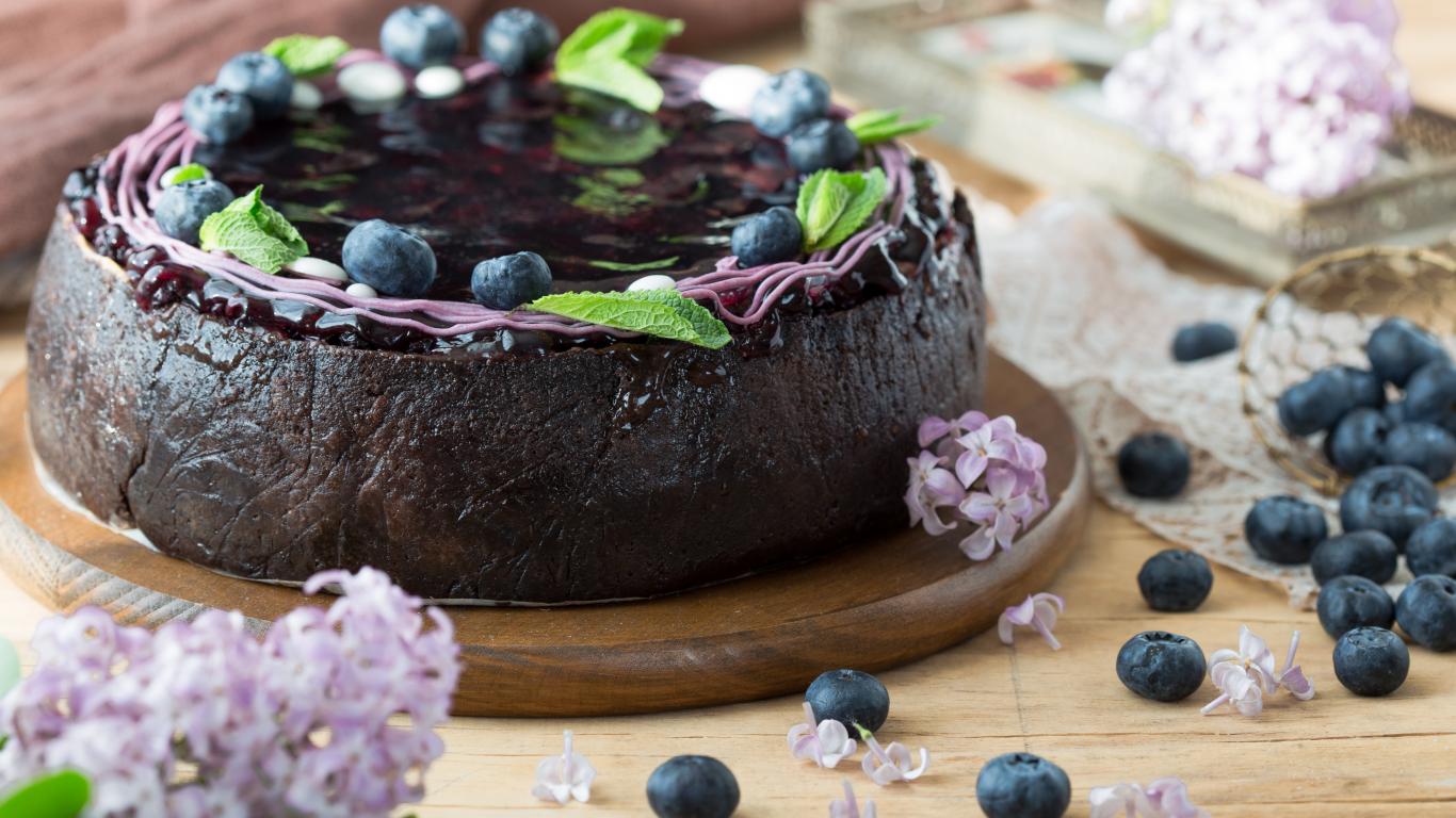 Wallpaper Pie with jam and blueberries on a table with lilacs