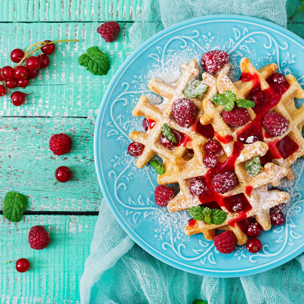 Wallpaper Appetizing waffles with raspberries, red currants and jam