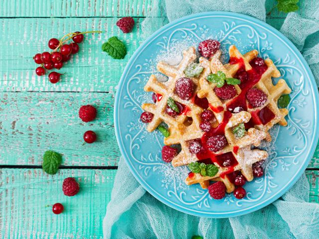 Wallpaper Appetizing waffles with raspberries, red currants and jam