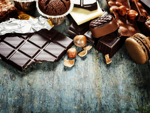 Wallpaper Chocolate on a table with nuts, muffins and sweets.