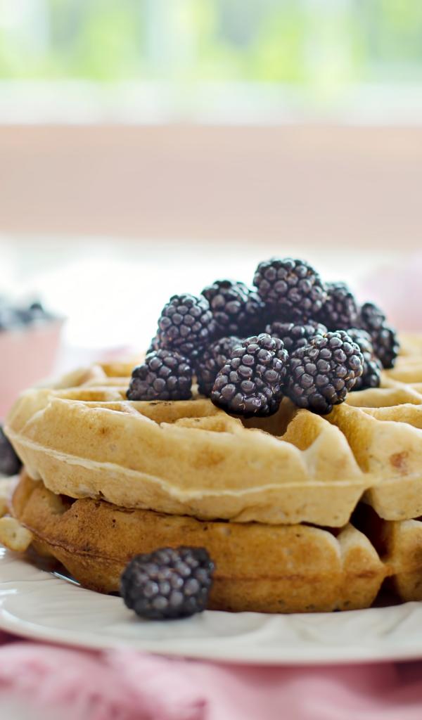 Wallpaper Sweet waffles on a white plate with blackberries