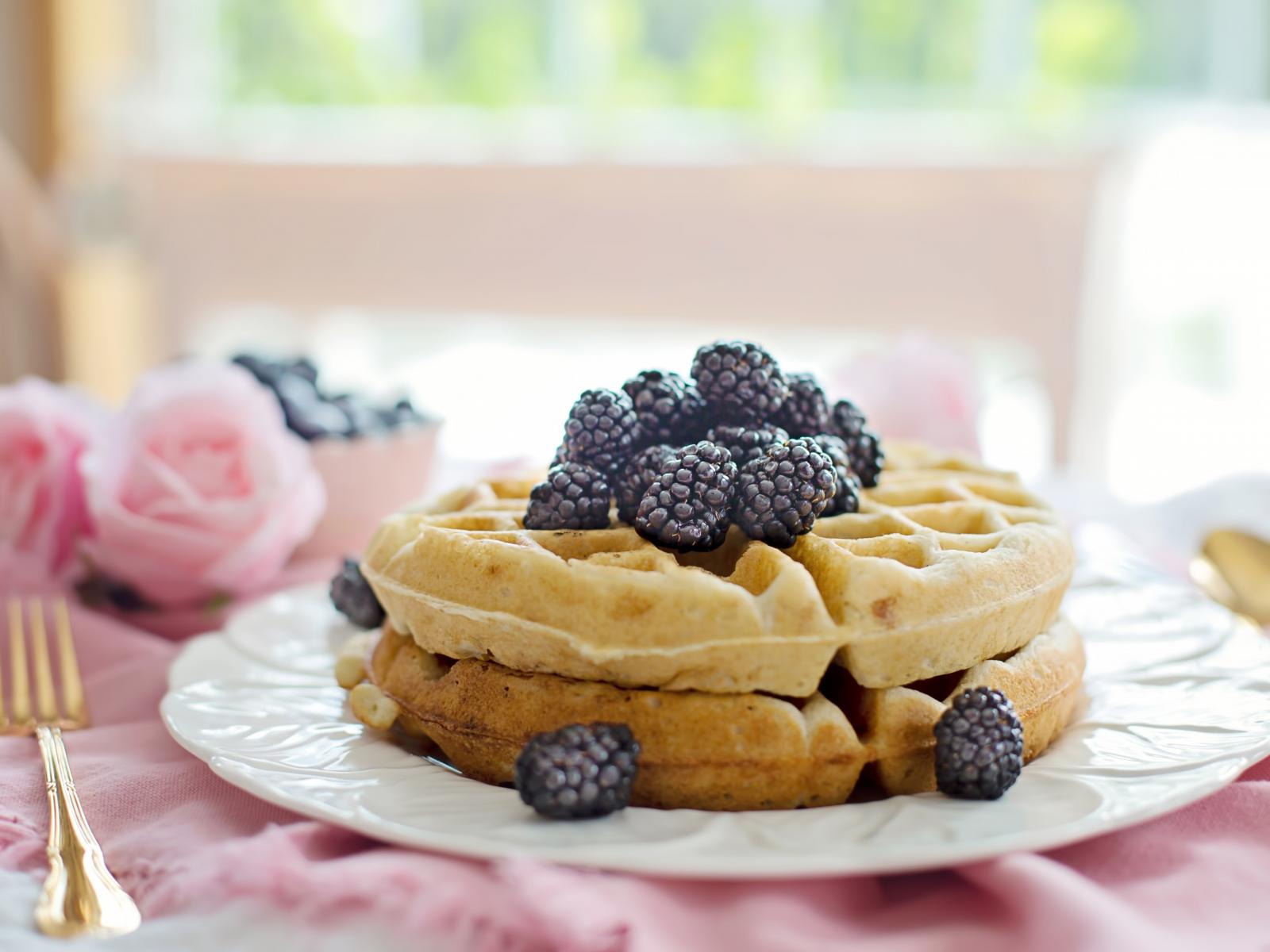 Wallpaper Sweet waffles on a white plate with blackberries