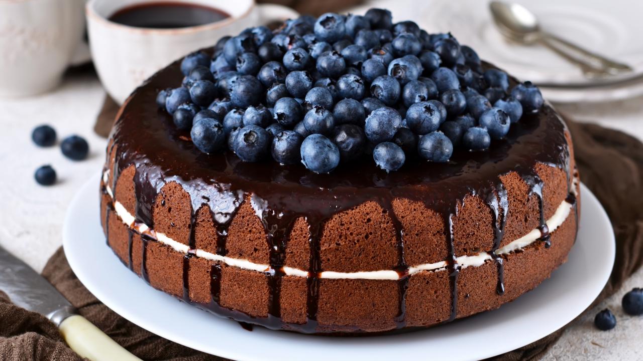 Wallpaper Chocolate cake with blueberries on a table with coffee