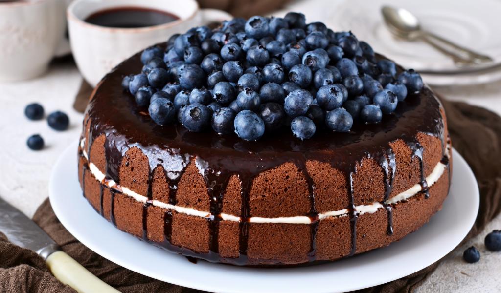 Wallpaper Chocolate cake with blueberries on a table with coffee