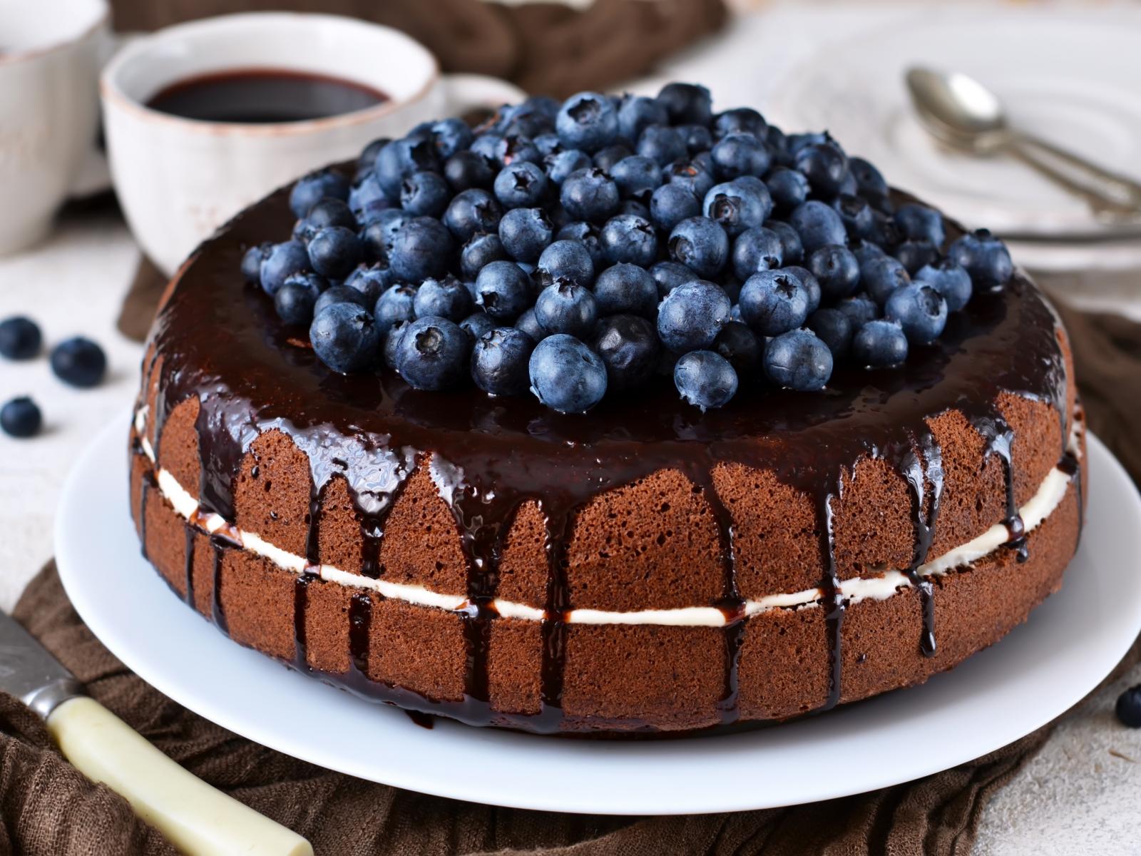 Wallpaper Chocolate cake with blueberries on a table with coffee