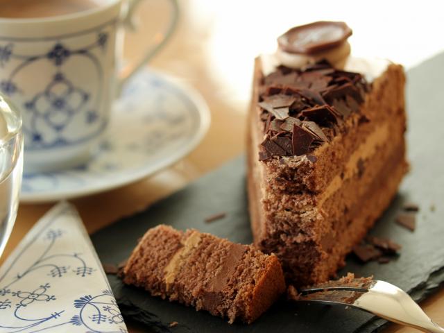 Wallpaper A piece of cake with chocolate on a table with coffee