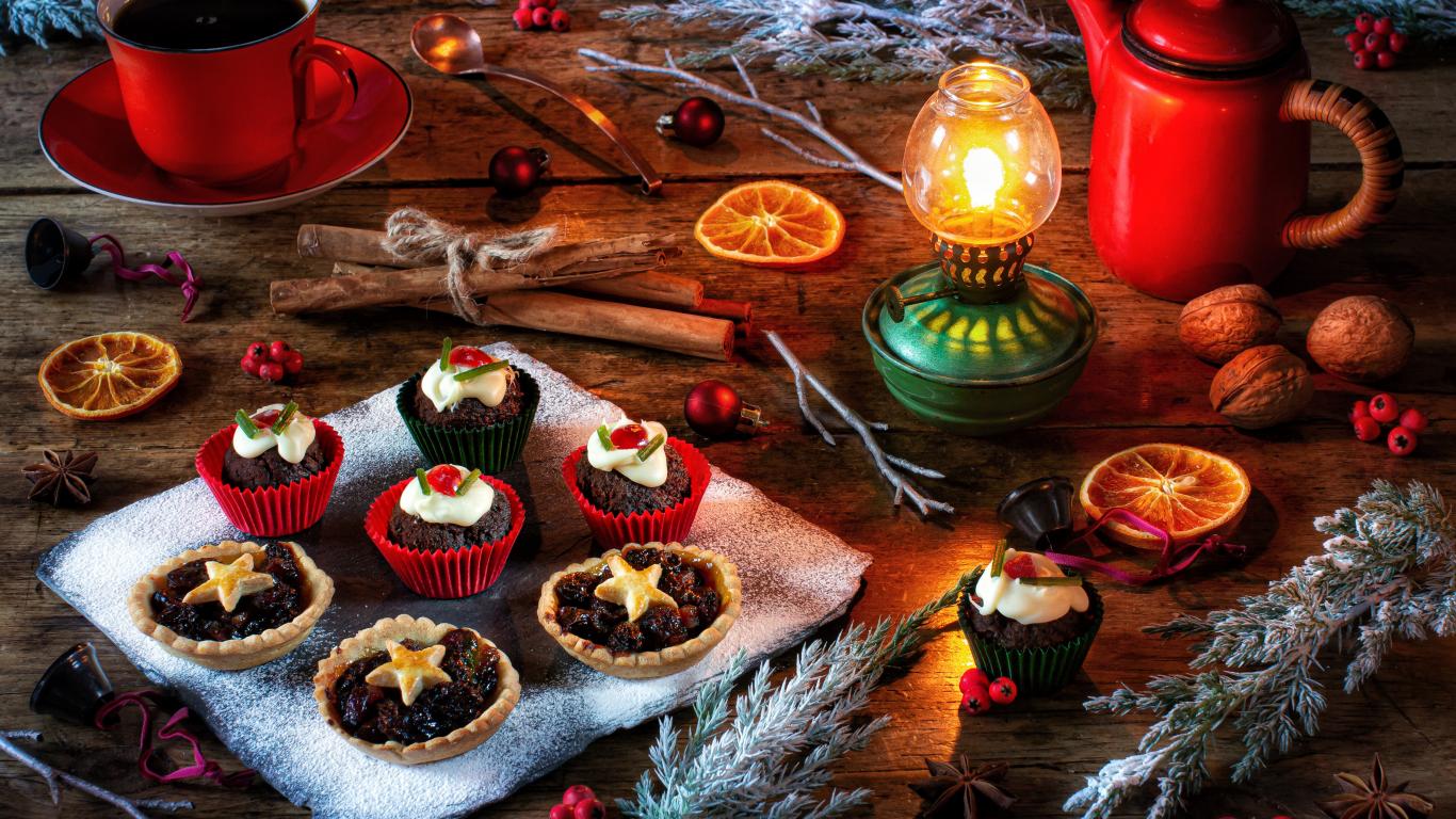 Wallpaper Different cupcakes on a table with a lamp and coffee