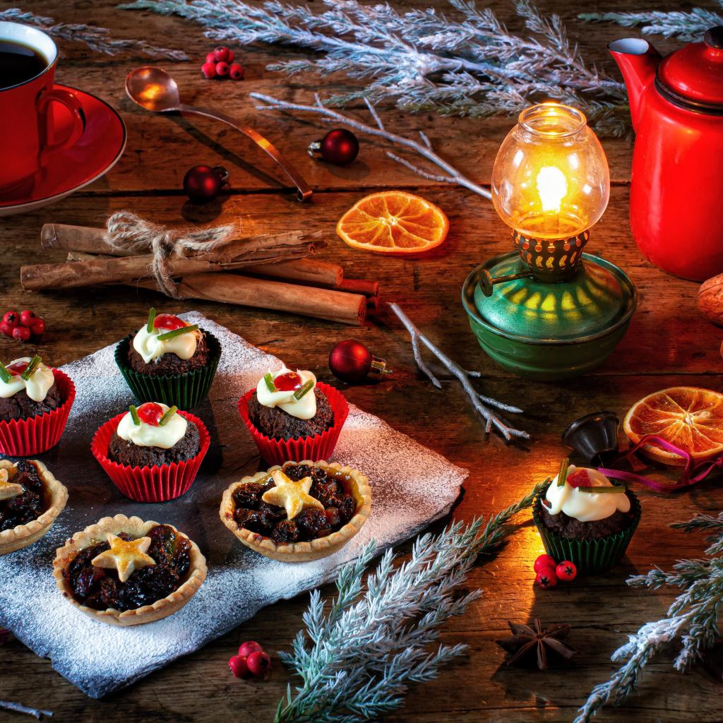 Wallpaper Different cupcakes on a table with a lamp and coffee