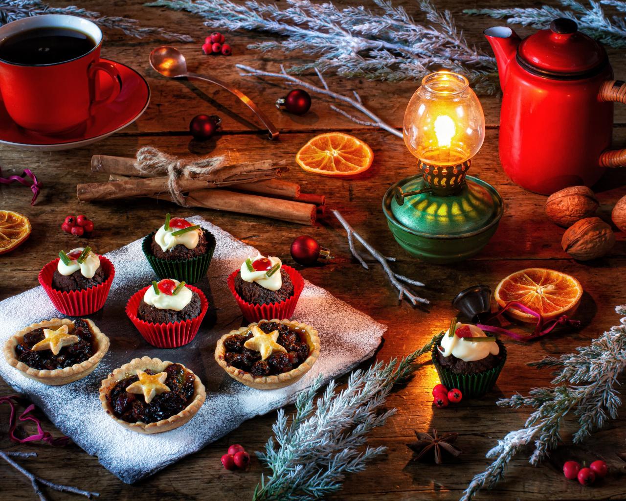 Wallpaper Different cupcakes on a table with a lamp and coffee