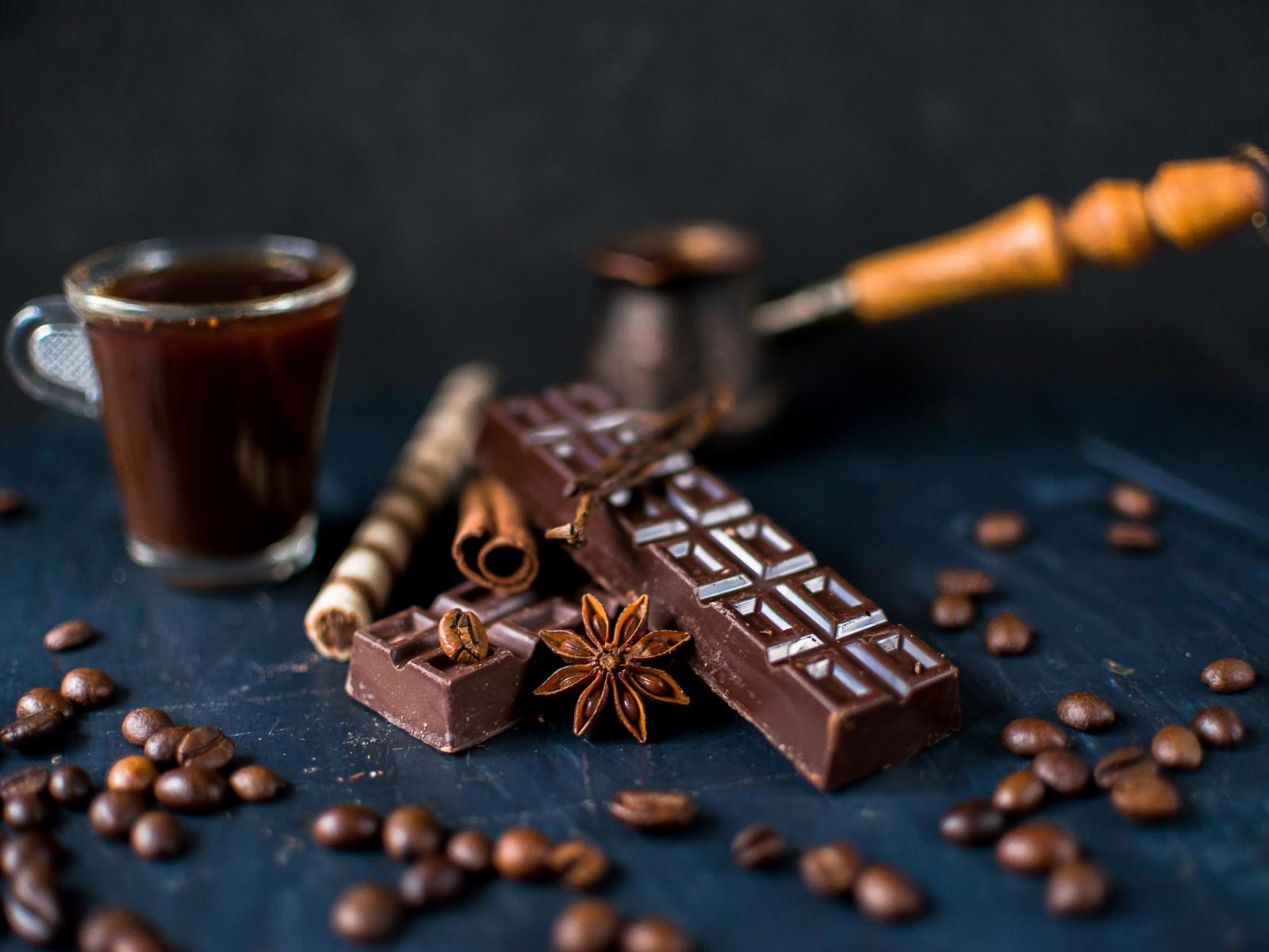 Wallpaper Chocolate bars on a table with straws and coffee