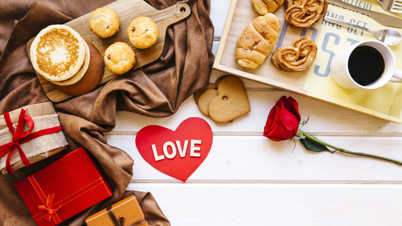 Wallpaper Fresh pastries on the table with gifts and coffee