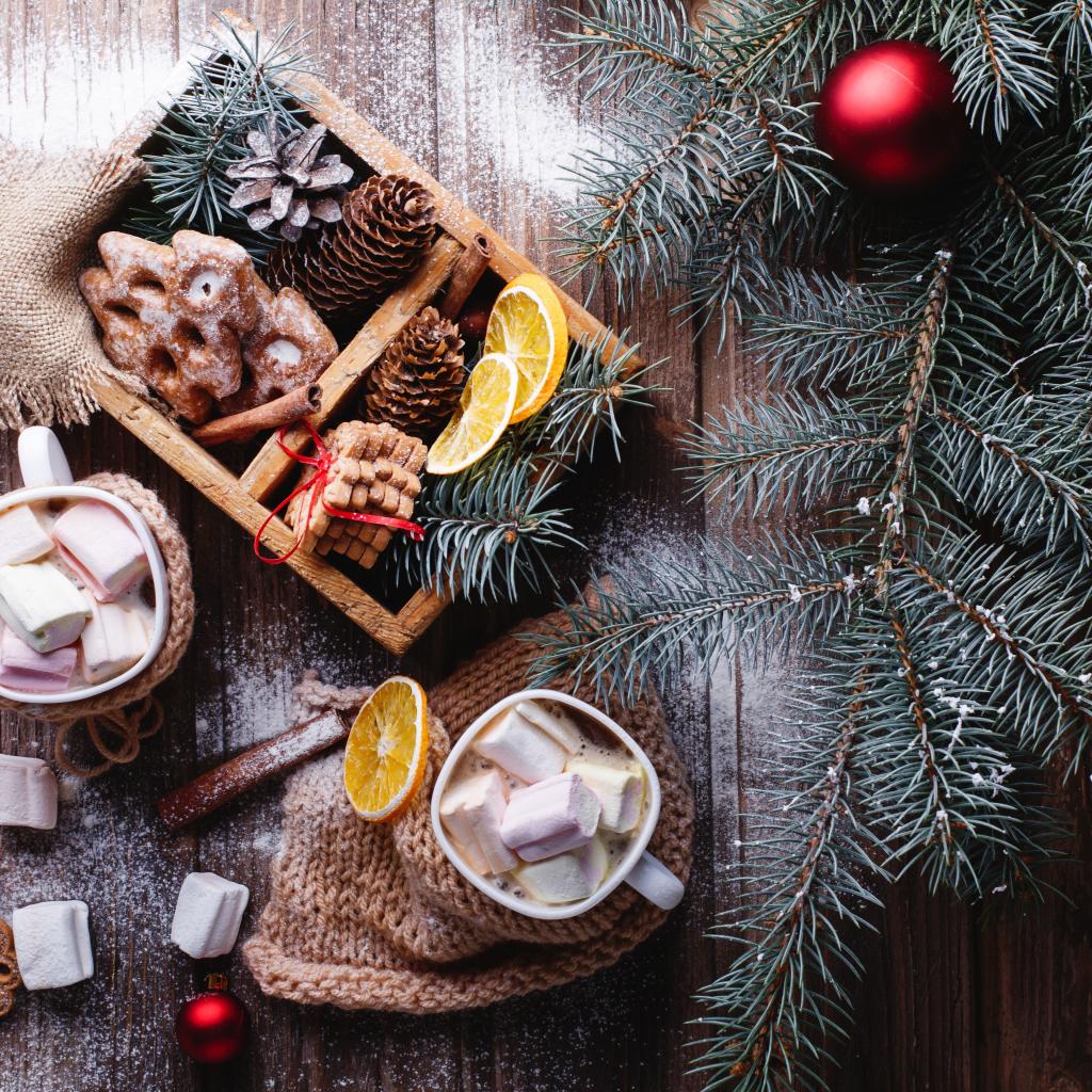 Wallpaper Green spruce branch on the table with cookies and cones