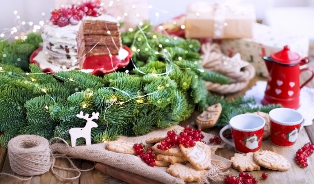 Wallpaper Christmas wreath with cake on the table with cookies