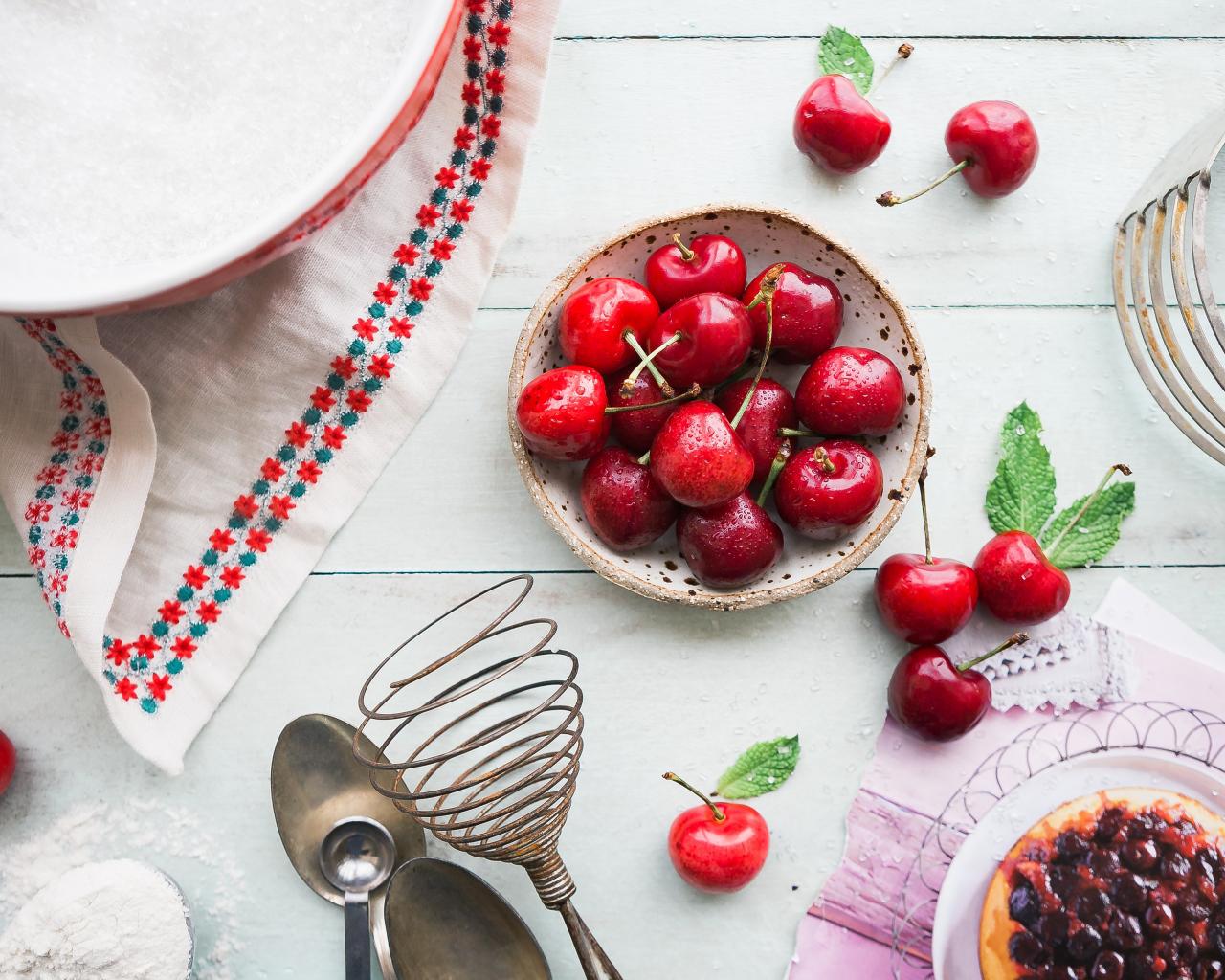 Wallpaper A piece of cake with cherries on a table with a cup of tea