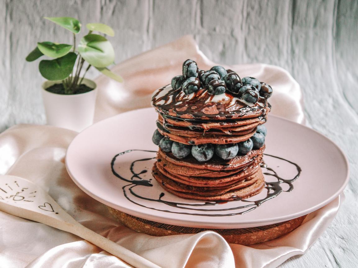 Wallpaper Chocolate pancakes with blueberries on a white plate