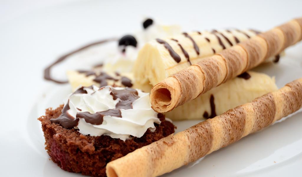 Wallpaper Cake on a plate with banana and sweet tubules