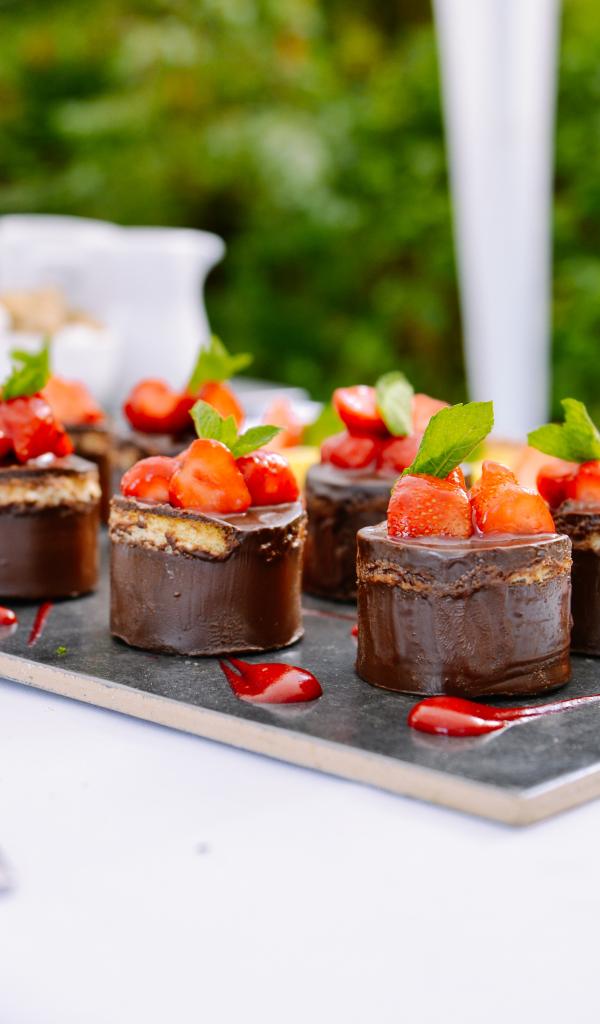 Wallpaper Chocolate brownie with strawberries on the table