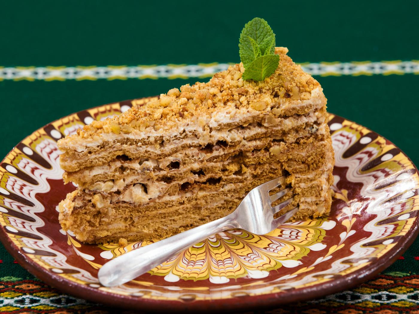Wallpaper Delicious honey cake with nuts on a beautiful plate