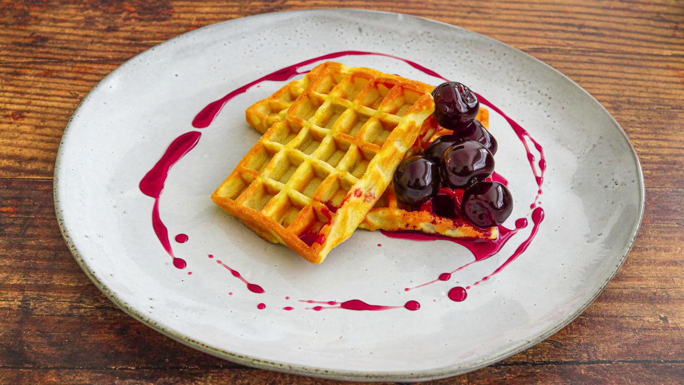 Wallpaper Appetizing sweet waffles with cherry jam