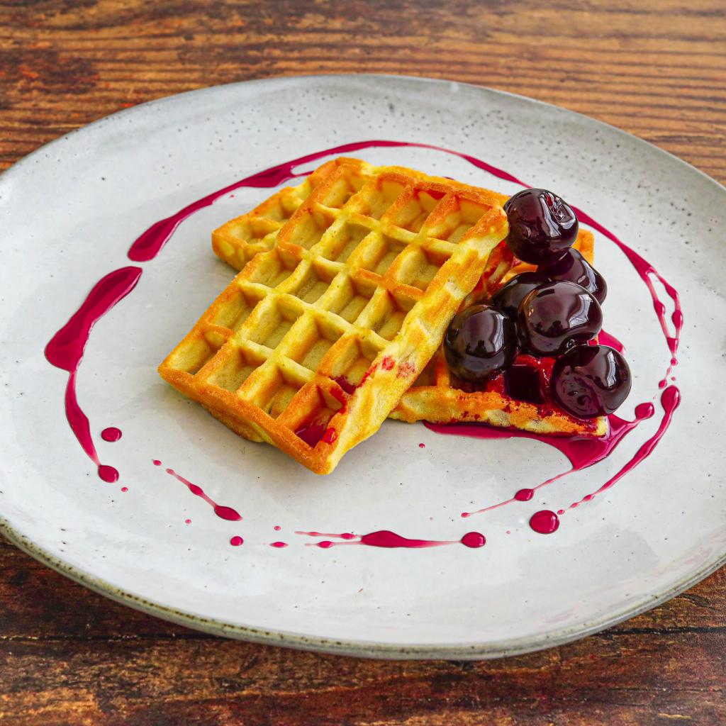 Wallpaper Appetizing sweet waffles with cherry jam