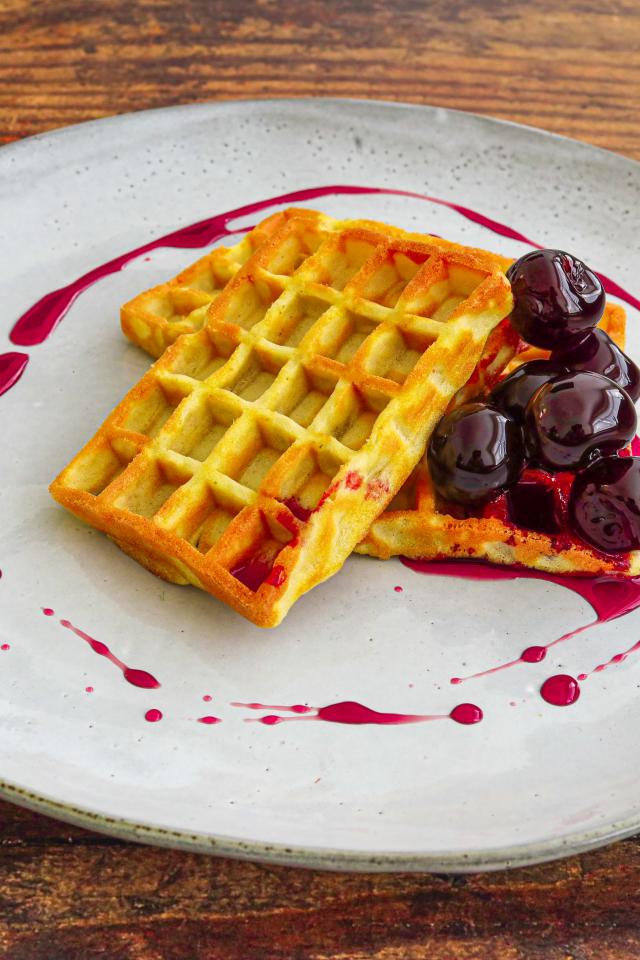 Wallpaper Appetizing sweet waffles with cherry jam