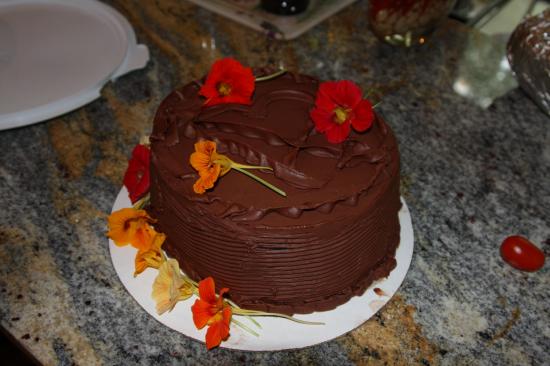 Wallpaper Appetizing chocolate cake with nasturtium flowers