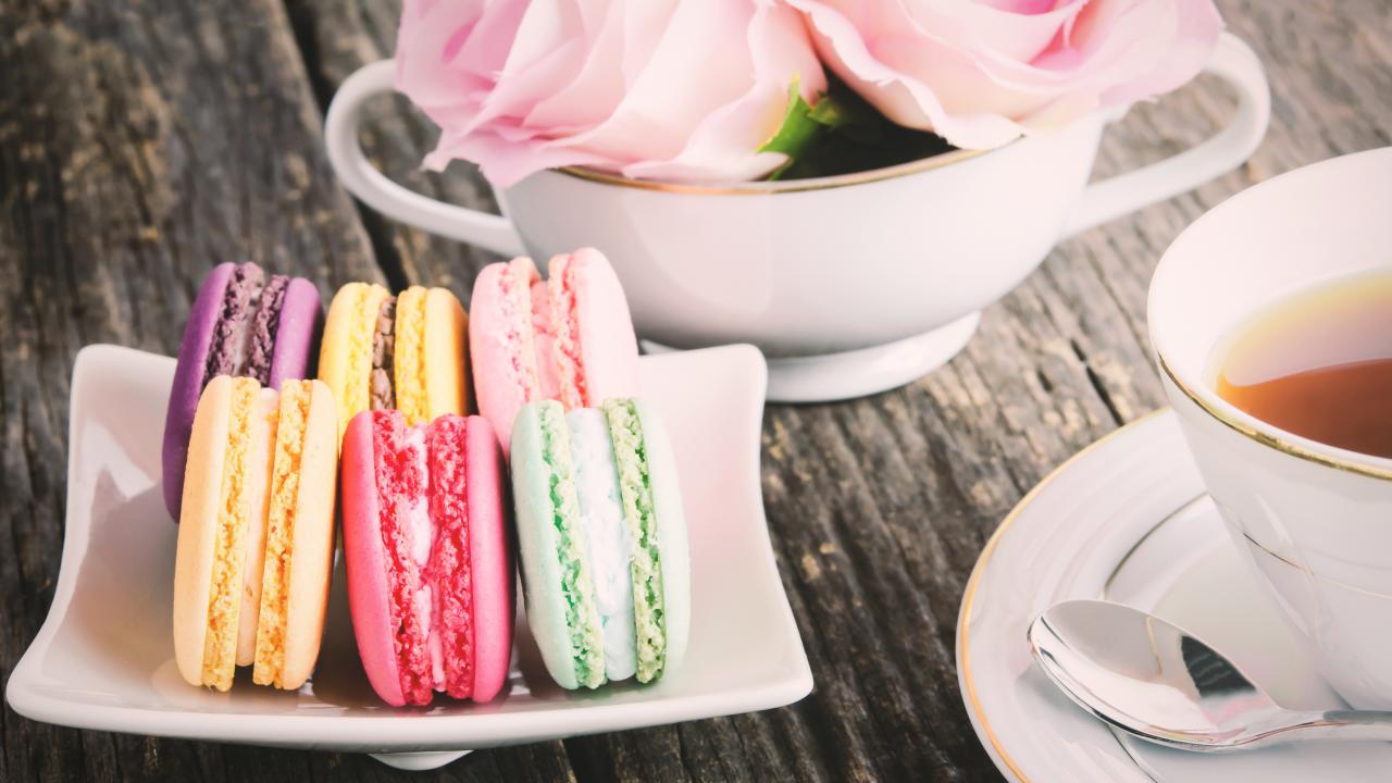 Wallpaper Dessert pasta on the table with tea and rose flowers