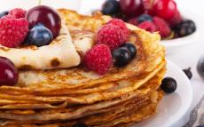 Wallpaper Fritters with honey and raspberries and blueberries on a white plate
