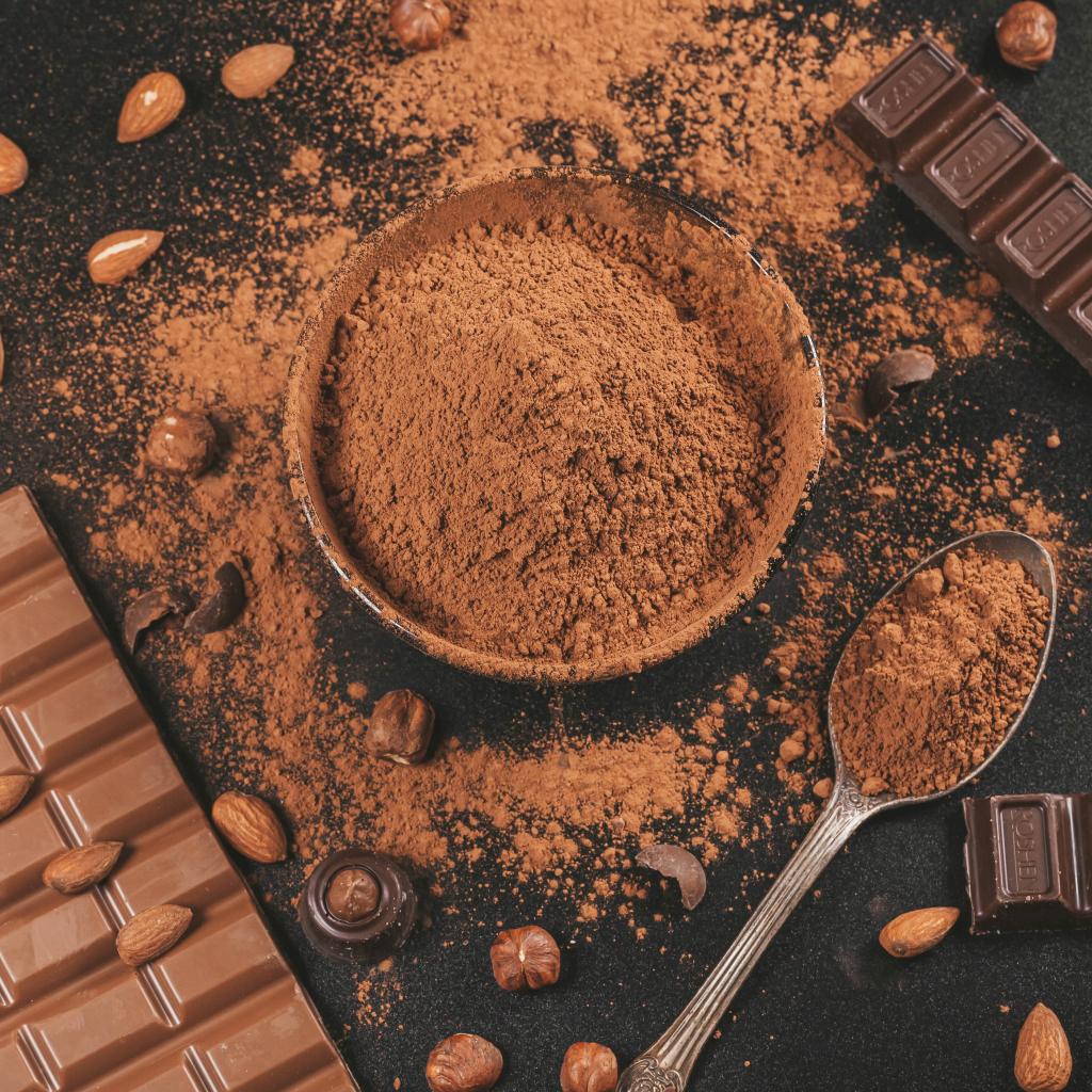 Wallpaper Cocoa on a table with nuts and chocolate bars