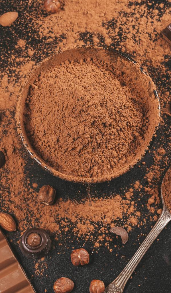 Wallpaper Cocoa on a table with nuts and chocolate bars