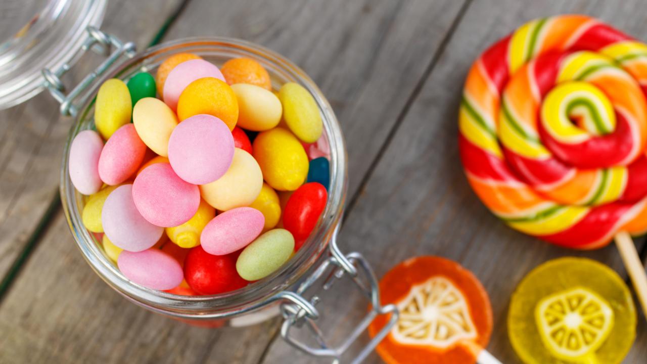 Wallpaper Multicolored lollipops in a jar on the table