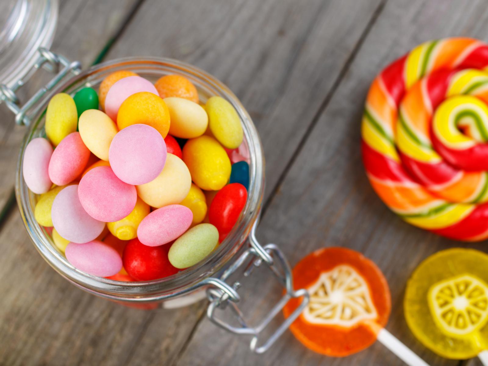 Wallpaper Multicolored lollipops in a jar on the table