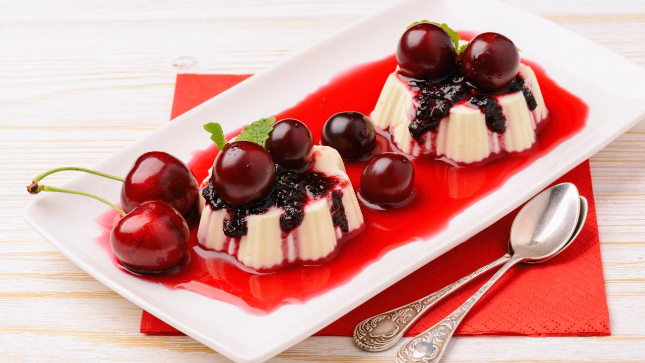 Wallpaper Milk dessert on a plate with cherries