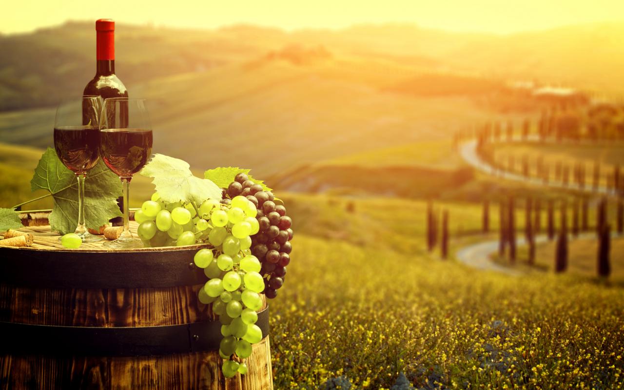 Wallpaper Two glasses with red wine and fresh grapes on a barrel