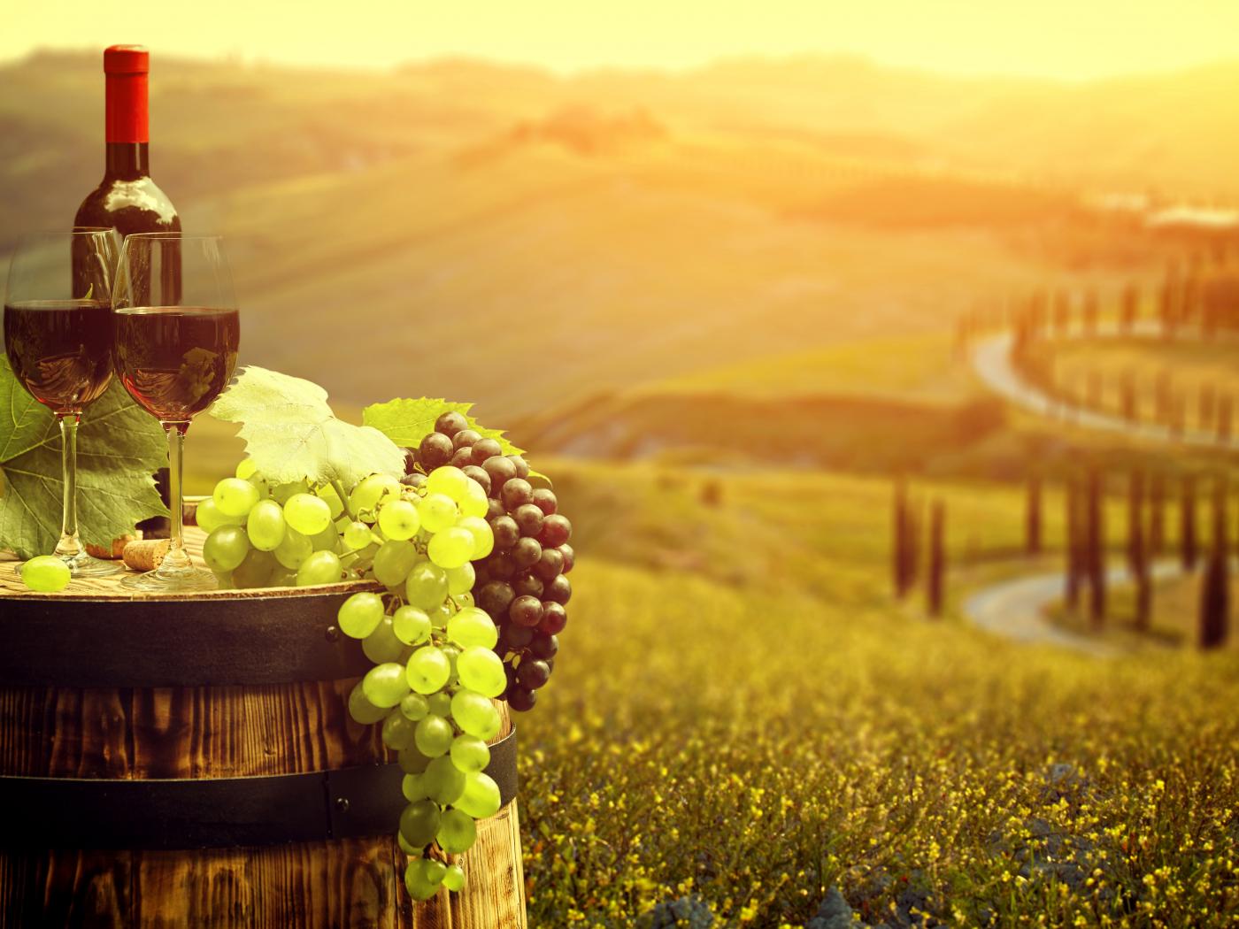 Wallpaper Two glasses with red wine and fresh grapes on a barrel