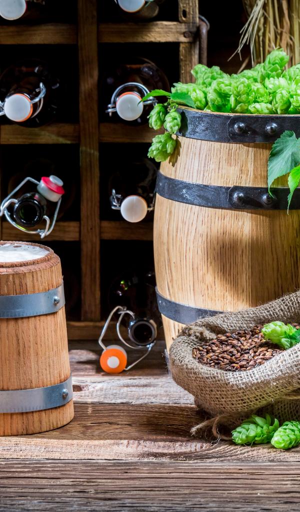 Wallpaper A glass of beer and a wooden barrel with hops on the table