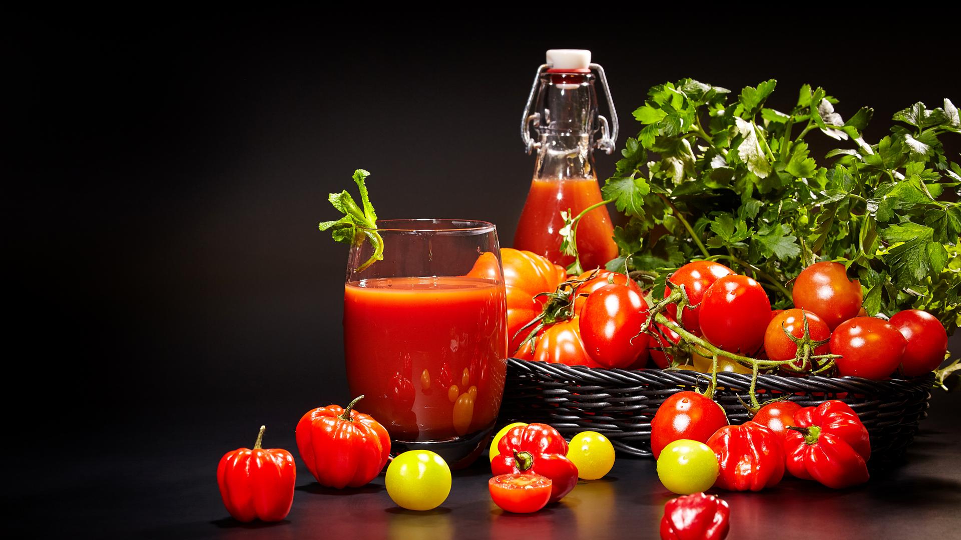 Wallpaper Tomato juice and fresh tomatoes on a table on a black background
